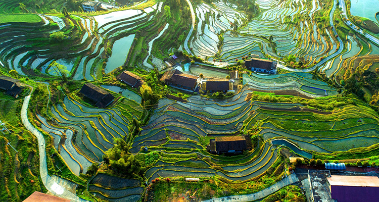 紫鵲界梯田高處無任何山塘、水庫,但山高林密,生態(tài)環(huán)境原始優(yōu)越,梯田依靠森林植被、土填、田埂綜合形成儲水保水系統(tǒng),憑借神奇獨特的基巖裂隙孔隙水源,構(gòu)成純天然自流灌溉工流水,四季不絕、久旱不竭、洪澇無憂,堪稱人類最偉大的水田工程。