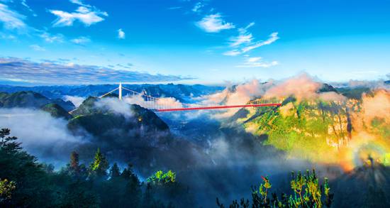矮寨大橋飛越在德夯峽谷之巔,是世界跨峽谷跨徑最大的鋼桁梁懸索橋,大橋跨徑1176米,橋面距離峽谷底部355米。2007年10月開(kāi)始修建,2012年3月建成通車,總造價(jià)15億元。大橋以克服了五大“世界級(jí)”施工難題和創(chuàng)造了四項(xiàng)“世界第一” 的高科技含量享譽(yù)中外,被贊為橋梁建筑藝術(shù)和自然景觀完美結(jié)合的典范。矮寨大橋不只是連接湘渝的重要交通設(shè)施,更是湘西的標(biāo)志性景點(diǎn)。