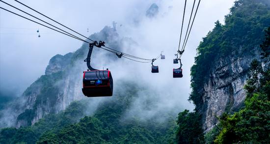 天門(mén)山索道全長(zhǎng)7455米,水平高差1279米,沿線(xiàn)盡為絕壁天險(xiǎn),氣勢(shì)沖天,是世界上最為壯觀的索道之一。它以張家界市中心城市花園為起點(diǎn),經(jīng)民間田園風(fēng)光而達(dá)山頂?shù)脑伎罩谢▓@,猶如一道彩虹飛渡“人間”“天上”。