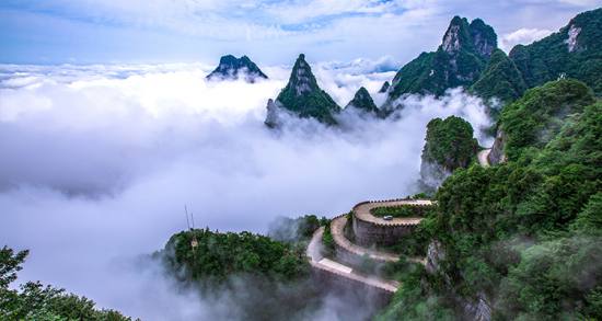 天門(mén)山盤(pán)山公路全長(zhǎng) 10.77公里,高差 1300多米,共有99道彎,因直達(dá)天門(mén)洞而得名“通天大道”。大道兩側(cè)空谷幽深,借山勢(shì)層層疊起,如巨龍盤(pán)旋,直通天際,被譽(yù)稱(chēng)為 “天下第一公路奇觀”。